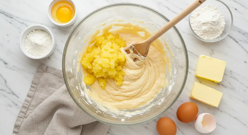 - Mix the Batter: In a bowl, whisk flour, baking powder, and salt; in a separate bowl, beat butter and sugar until fluffy, add eggs one at a time, then mix in vanilla. Alternate adding dry ingredients with pineapple juice and milk until smooth, then fold in crushed pineapple.